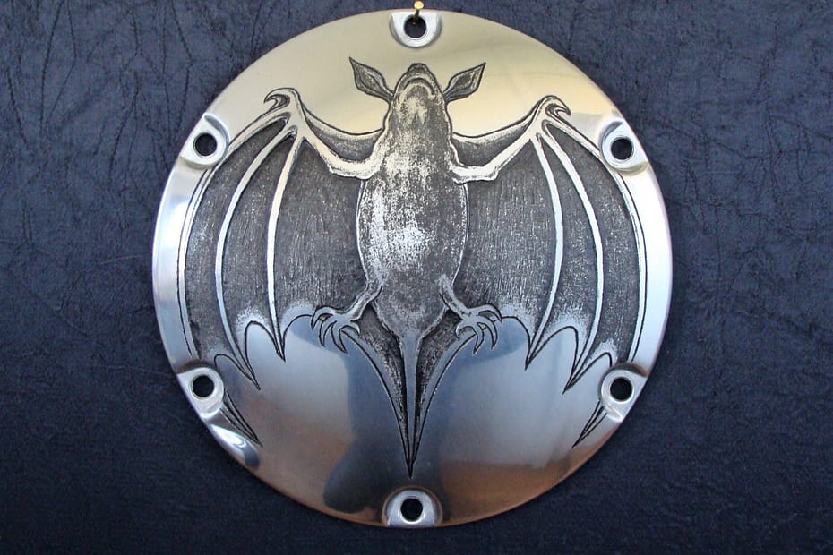 Hand engraved in an aluminium derby cover, family crest themed ‘Bat-woman’ with banner & motto.