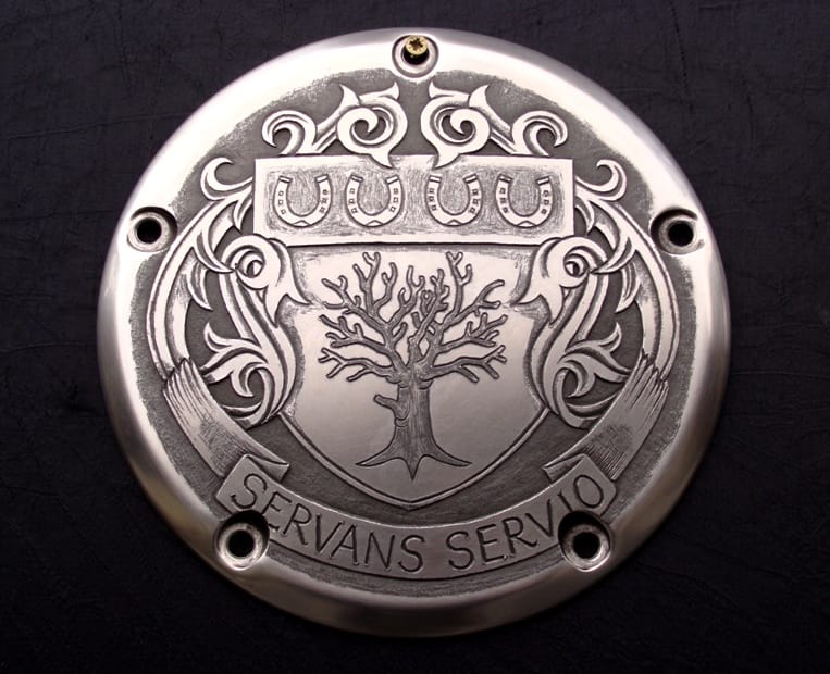 Heraldic- Family Coat of Armsby Paul HolbrechtFebruary 9, 2014February 9, 2014Heraldic- Family Coat of Arm Motorcycle engraving on a Harley-Davidson derby cover