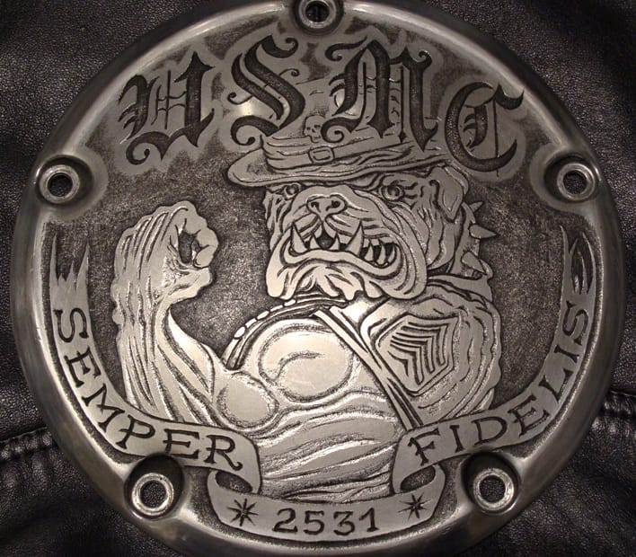 Hand engraved aluminium Harley-Davidson derby(clutch) cover, made on commission for a USMC-Marine’s motorcycle. Each engraved… Read More »‘U.S.M.C. & Devil Dog II’ relief engraved in a H-D derby cover