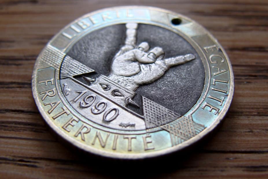 Oldschool love symbol, made to wear as a pendant. Hand carved in a 1978 French… Read More »‘Heart & Arrow’ coin carving, love-themed token/pendant